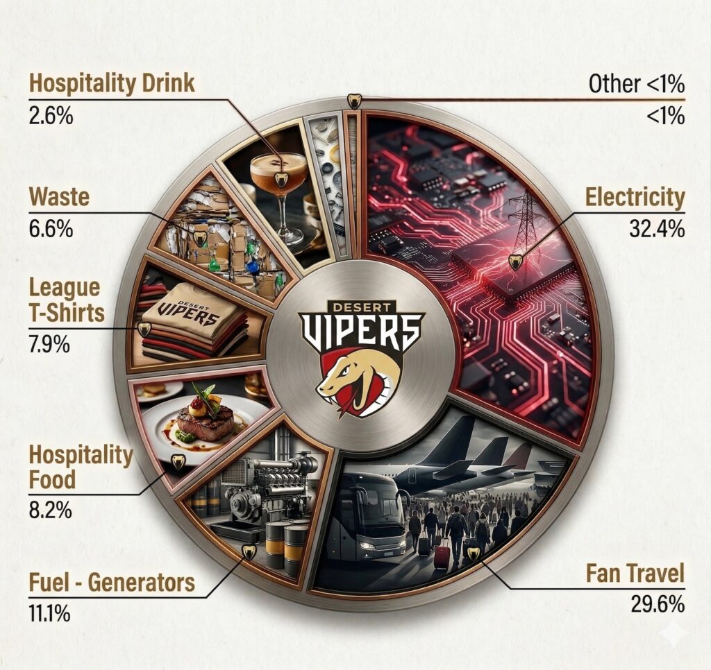 The Desert Vipers’ approach to reduction of carbon emissions in Season 4 focused first on measurement and reduction, followed by offsetting unavoidable emissions. In partnership with Vuelta Carbon, the emissions from the Sustainability Match will be completely offset through verified projects. This reduction-first approach ensures that offsetting acts as a supporting measure, helping to maximise overall positive impact while longer-term emission reductions are pursued.