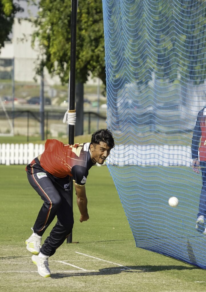 The eve-of-match practice session at the ICC Academy at Dubai Sports City was the first time all the squad had been together, with Khuzaima bin Tanveer, Qais Ahmad and Andries Gous all involved in the latter stages of the T10 tournament in Abu Dhabi, while Tom Bruce was a late arrival after domestic commitments in New Zealand.