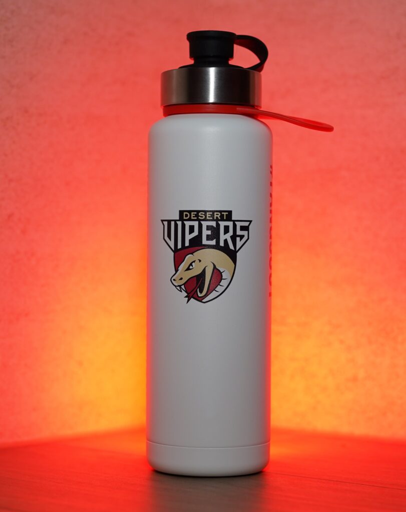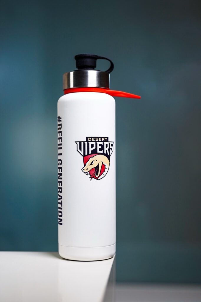 In hospitality in Season 4, we have switched from PET bottles (which you’ll see all five other teams using) to TetraPak, through a partnership with Aqualy. These bottles are Desert Vipers-branded.