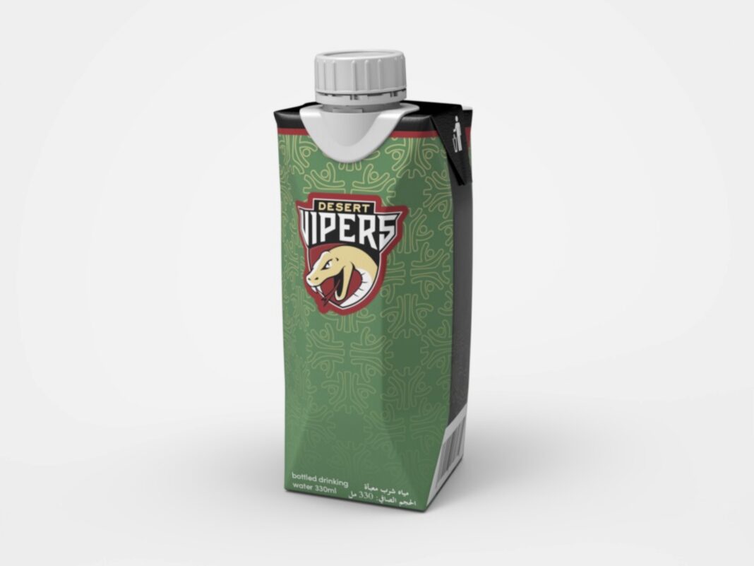In hospitality in Season 4, we have switched from PET bottles (which you’ll see all five other teams using) to TetraPak, through a partnership with Aqualy. These bottles are Desert Vipers-branded.